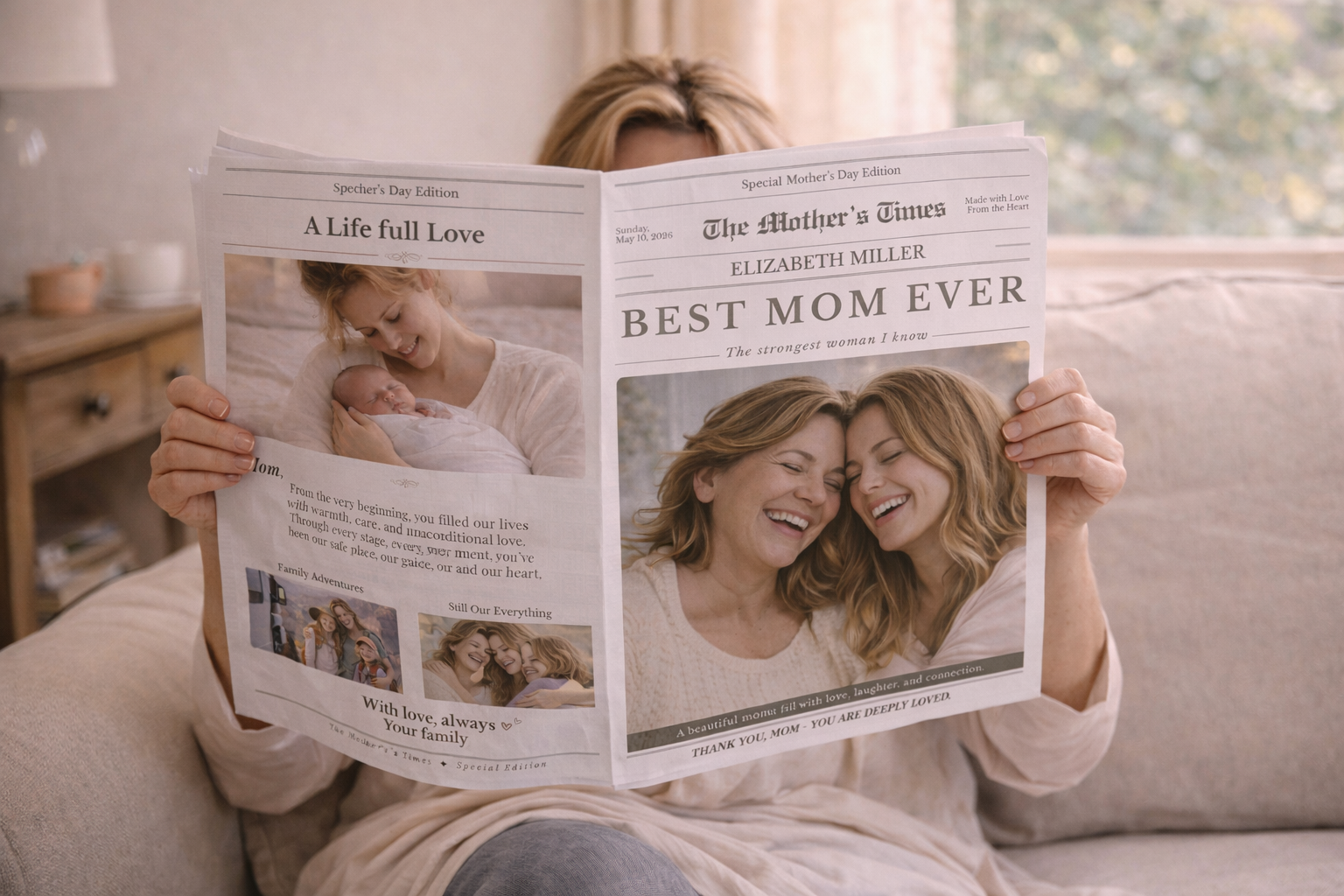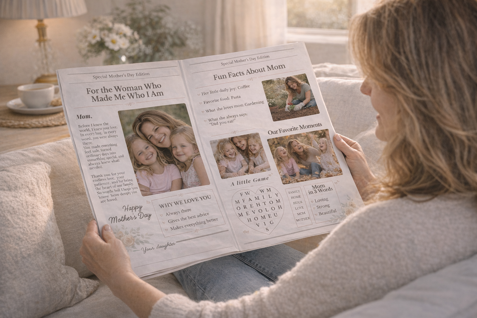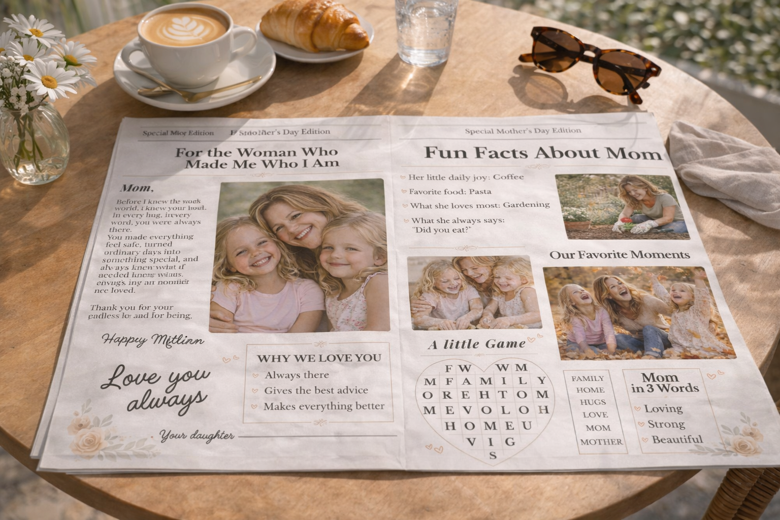 See muudetav emadepäeva ajalehe kujundus võimaldab sul luua täiesti isikupärase kingituse, kuhu saad lisada fotod, lood ja armsad sõnumid.
